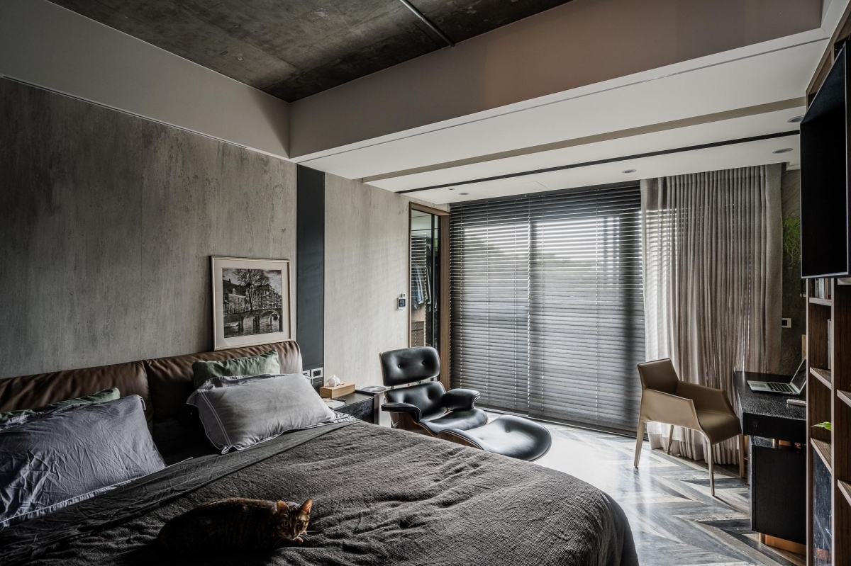 In the public sphere on the first floor, the corridor in the middle of the dining room is used as the axis to delineate the spaces. In the living room, the main TV wall has a circular line to ensure a smooth traffic flow. The stone texture on the floor extends the main wall. The tension of light and dark colors is created by the sharp division of metal lines, which also injects a sense of extravagant. The large painting on the wall behind the sofa is like a sea of clouds. The lines with a sense of rhythm implant a vivid vitality into the space. White light falls on the dining room and kitchen. The dining room is divided into a Chinese-style round table and a Western kitchen island with a bar to match with different cuisines. The floor-to-ceiling windows next to the kitchen island bring in a beautiful view and natural light. Family members can enjoy a relaxing afternoon tea. Next to the round table is a display case of the owner's collection, making it a great conversation starter during meals. On the other side of the display case is a guest room for overnight visitors. The raised floor is combined with a tatami-like material. After putting cushions, every inch of space is used to the fullest extent.